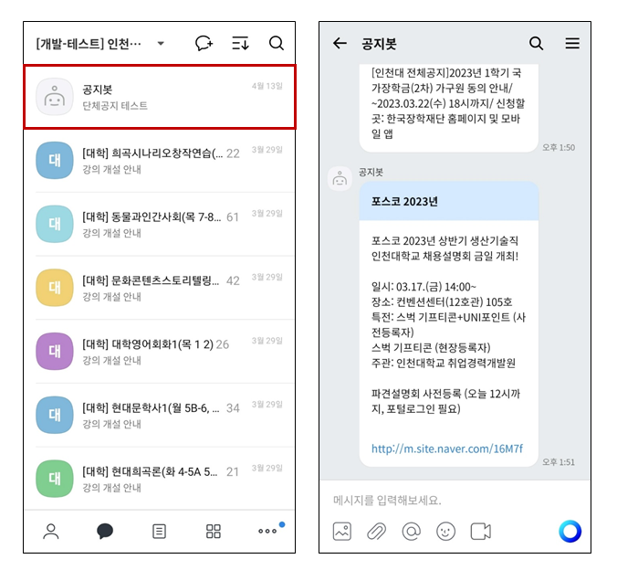 카카오워크를 설치하고 접속한 학생들은 학교에서 안내하는 각종 알림 메시지들을 공지봇이 전달해 줍니다. -