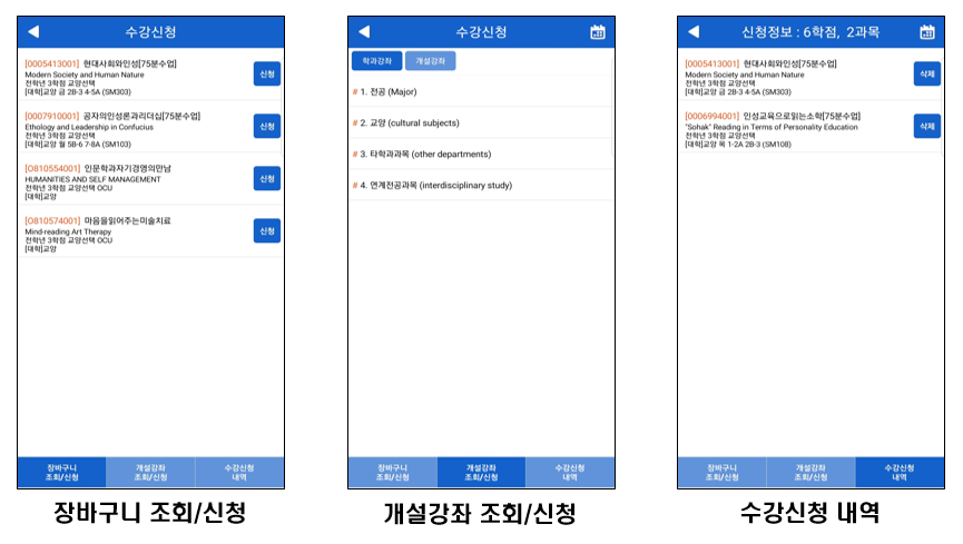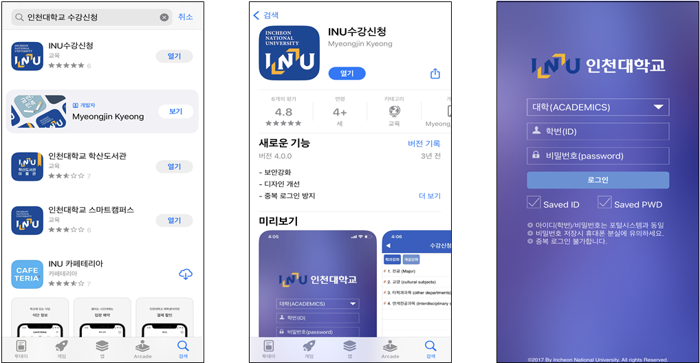 우리 대학 학생들이 편리하게 수강신청할 수 있는 모바일 앱입니다. 장바구니, 개설강좌, 시간표 등 수강신청에 관한 정보를 제공합니다. 서비스 대상 학생(학부생) 설치 방법 Android : Play 스토어에서 “인천대학교 수강신청” 검색 iOS : 앱스토어에서 “인천대학교 수강신청” 검색 주요 기능 장바구니 조회 및 신청 개설강좌 조회 및 수강신청 수강신청 내역 확인 시간표 확인